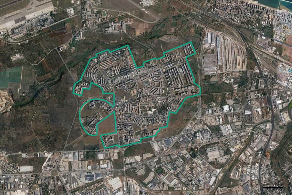 Si tratta del primo quartiere “satellite” di edilizia residenziale pubblica costruito a Bari, lambito da un corridoio di potente naturalità, ovvero il Parco naturale regionale di Lama Balice, una delle lame che attraversa la Murgia barese e arriva fino al mare, solcando la “conca” di Bari.